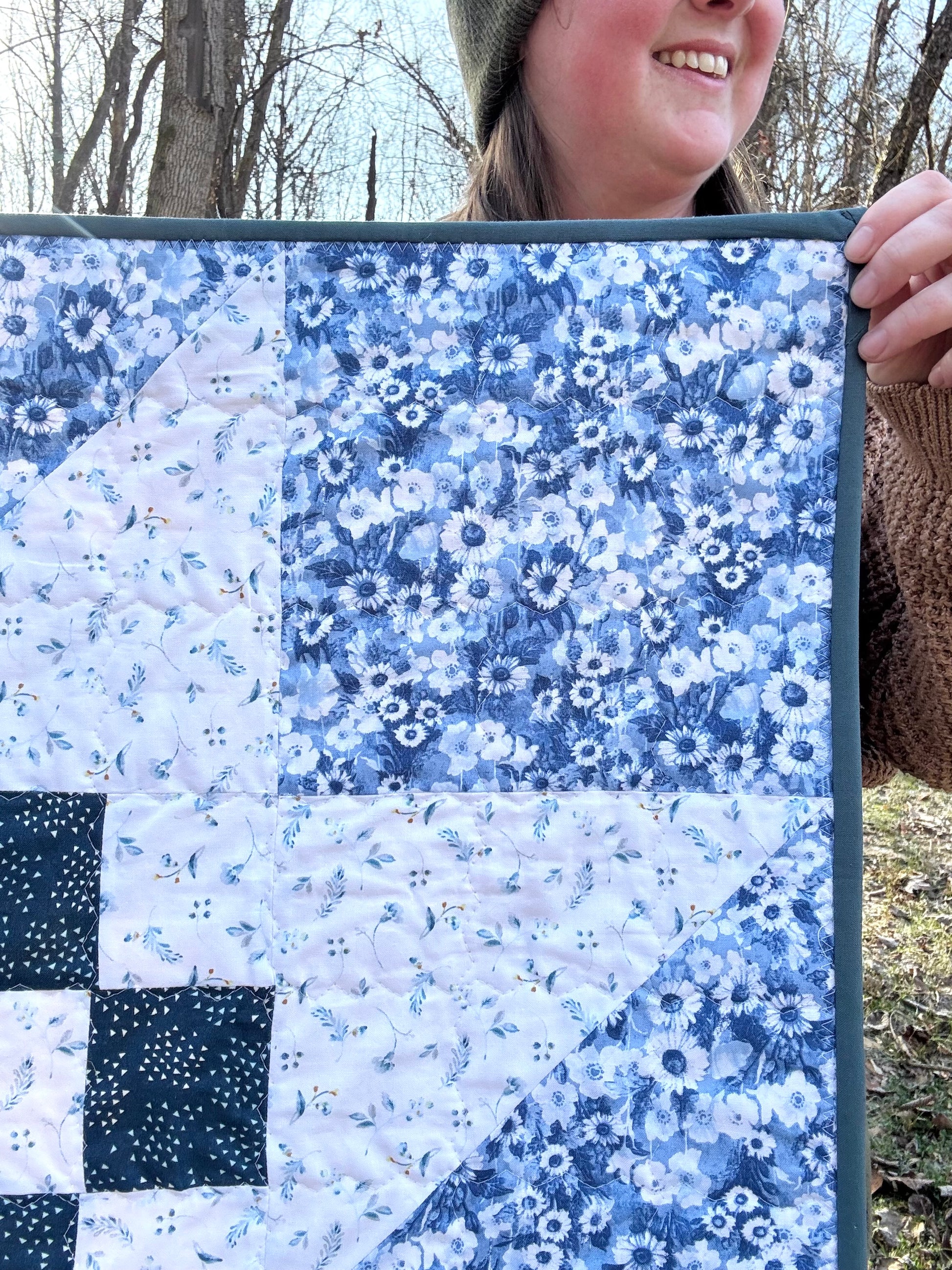 2. Blue Floral Quilt: blue floral print paired with a navy and white floral checkered board.