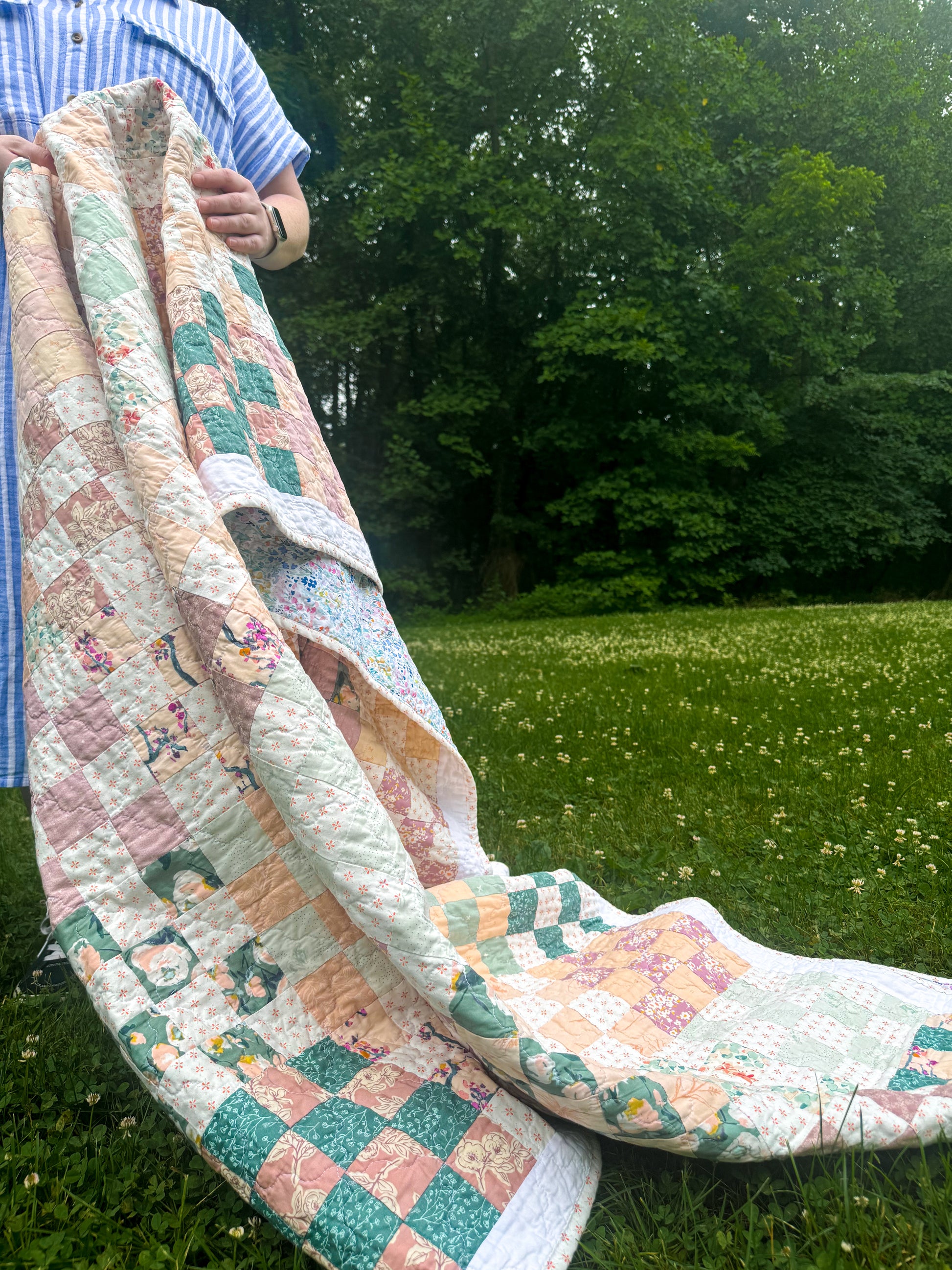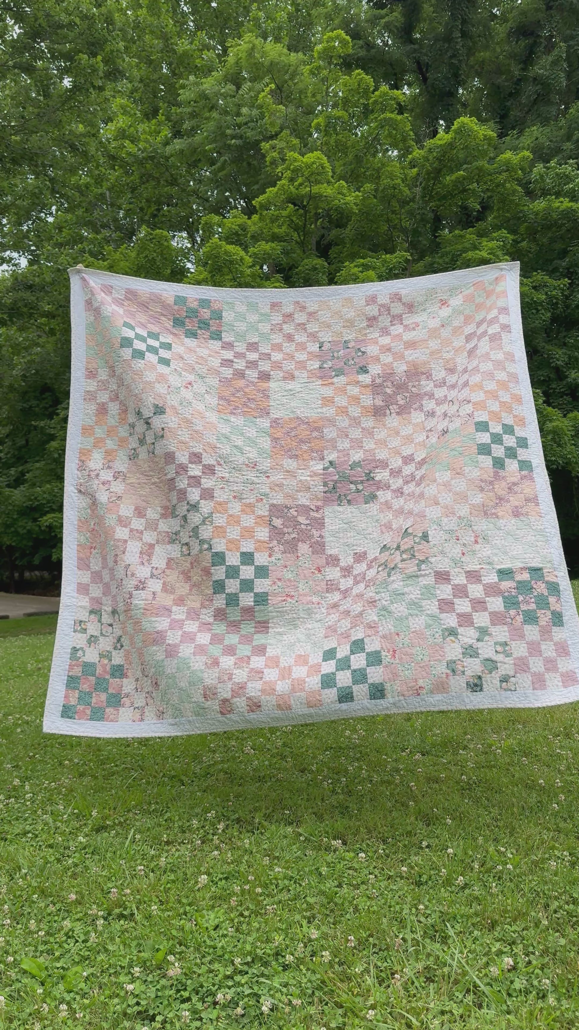 A beautiful, classic quilt that works with both contemporary and traditional home styles. This quilt is made in a traditional 16-patch design, accented with an all-over serpentine stitch quilting. The backing is gorgeous with a plentiful floral print reminicent of a garden. Quilt is bound in a coordinating, white and coral binding. It’s oversized in nature and will drape well on a twin -please take a moment to measure this out to determine if it is the right size for you before ordering.